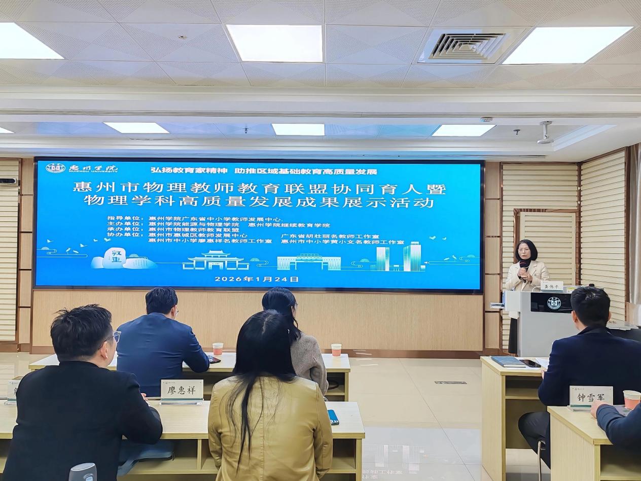2026年1月24日,惠州市物理教师教育联盟协同育人暨物理学科高质量发展成果展示活动在惠州学院举行。活动由惠州学院省级中小学教师发展中心指导,惠州学院能源与物理学院、继续教育学院主办,惠州市物理教师教育联盟承办,惠城区教师发展中心、广东省胡壮丽名教师工作室、惠州市中小学廖惠祥名教师工作室、惠州市中小学张齐峰名教师工作室、惠州市中小学黄小文名教师工作室协办。活动旨在大力弘扬教育家精神,发挥惠州市物理教师教育联盟平台优势,助促区域物理学科省、市级名教师工作室建设提质增效,助推物理学科协同育人,助力惠州学院物理学教育部师范专业二级认证。能源与物理学院党委副书记邓伟浩、副院长万凯联袂主持活动。