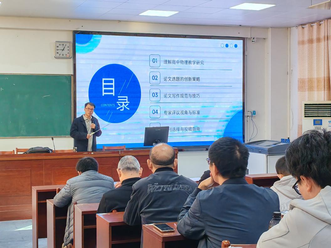 2025年12月18日上午,吴仍来老师作了题为《实际问题驱动的高中物理教学研究--以命题、实验问题为例》的专题讲座,内容包含高中物理教学研究理念、论文选题的创新策略、论文写作规范与技巧、专家评议视角与标准、期刊选择与投稿指南,覆盖了教研活动的全流程。基于“课堂即实验室”的核心教研理念,结合具体案例,分析了命题范式从“知识本位”向“素养立意”的转型路径,并展示了如何借助数字化工具进行命题和实验创新方面的教研活动,使科研真正服务于教学改进。